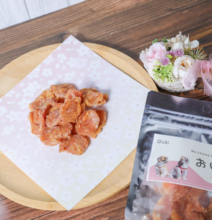 サバはDHA、EPAが豊富で、血圧を下げたり血液をさらさらにするなどの効果が期待される栄養素がたっぷり含まれることで知られています。わんことにゃんこのおいちの月間売上ランキングではこのサバジャーキーは毎月トップ3に入る自慢の商品です。旅館のウェルカムおやつとしても使用されており、大変人気のおやつです。