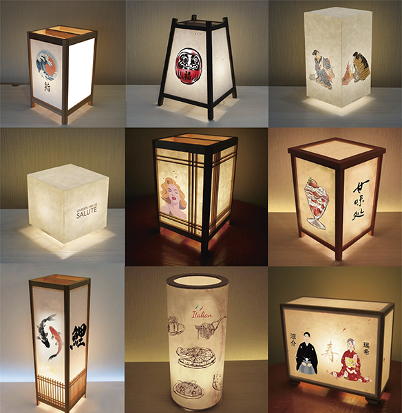 ロゴ入れ・名入れ・文字入れ・オリジナルデザインを作成し、純和風、和モダン行灯など種類豊富。