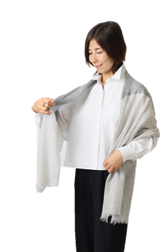大判エアリーストール。高品質とされる内モンゴル産原料を使用し、ふわっと柔らかな肌触り。大判でありながら、75gの軽さでふっくらとしたカシミヤの風合いで適度なボリューム感でエレガンスを演出。