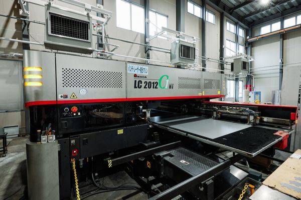 CO2レーザー・タレパン複合機でブランク形状をカットし、プレスブレーキで曲げ加工を行います。