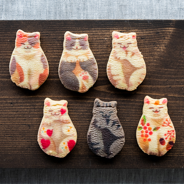 さっくりとした素朴なクッキーは、どの年代の方にも好評です。黒縞柄は黒ごま味、その他の柄はプレーン味です。三毛猫、ハチワレ、茶縞、黒縞、ハート柄の猫が入っております。