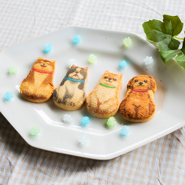 可愛い犬型のクッキーです。フレンチブルドッグとチワワは素朴な味のバタークッキー。プードルと柴犬はメープル風味となっております。