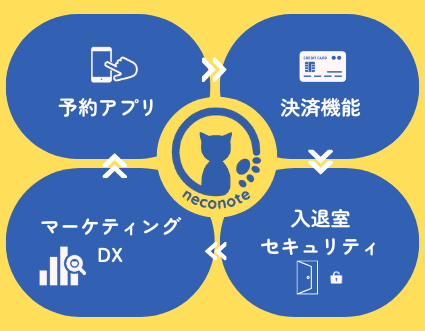 予約アプリ、決済機能、入退室管理、そして来場者の予約情報をもとにしたマーケティングサポートの4つの機能を搭載しています。