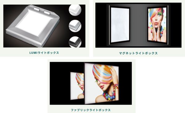 LEDライトボックスは、LUMI PANELを用いた内照式ライトボックスです。軽量設計と高い視認性を兼ね備えた照明ソリューション。屋内外を問わず、商業施設や展示会、店舗などで幅広く活用されています。屋内・屋外場所を選ばずご使用いただける製品です。 マグネットライトボックスはポスターの入れ替えをより手軽にできる上、片面/両面かつコーナー形状をR型と角形からお選べる製品です。 ファブリックライトボックスは、軽量で薄型、さらにフレームレスデザインが特徴です。画面いっぱいのビジュアル表示が可能であり、さまざまなシーンで活躍する人気の高い製品です。