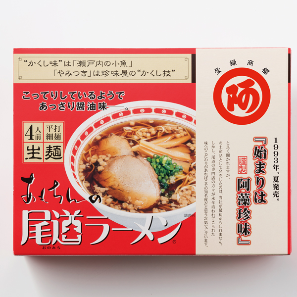 醤油ベースのスープに豚脂が浮いた平打ち麺のラーメンです。かくし味に瀬戸内の小魚を使ってお土産パッケージで売り出した最初の「尾道ラーメン」が阿藻珍味のこの商品です。今年で発売32年、累計1億食を超える人気のご当地ラーメンです。
