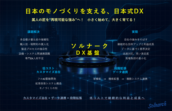 ソルナークDX基盤は、フルAI駆動開発、拡張容易システム構造、さらに、現場を知るモノづくりの知識と経験を基に、日本のモノづくり現場特有の課題を根本解決いたします。