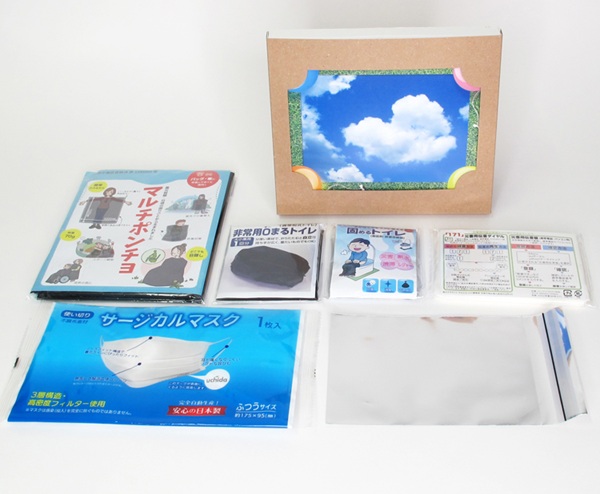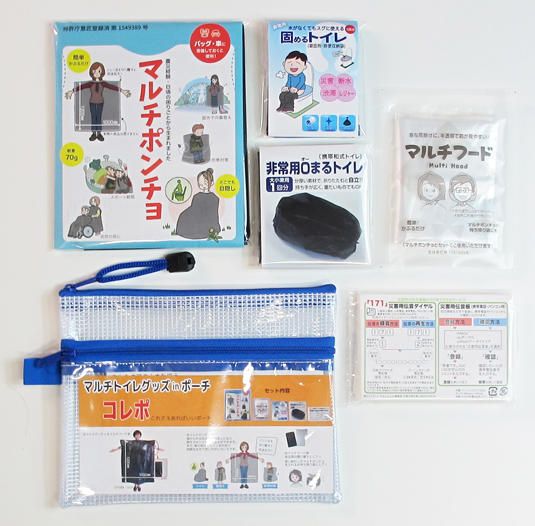“トイレ”を最優先に備える防災グッズ5点がポーチに入ったセットです。能登半島地震でもトイレ・プライバシーが問題でした。