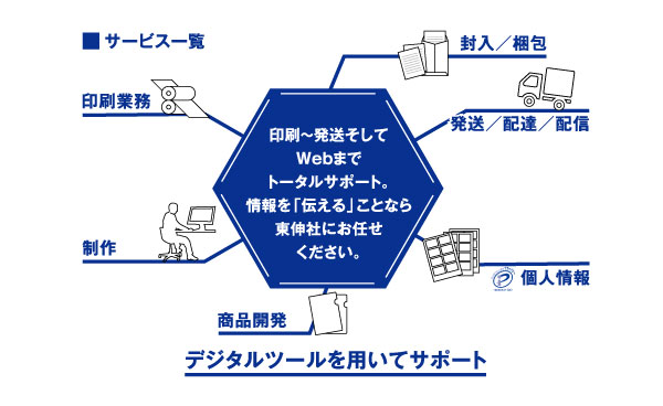 ■紙の情報媒体を中心に、印刷・個人情報処理・封入加工・発送までをワンストップでご提供する『一気通貫サービス』を展開しています。