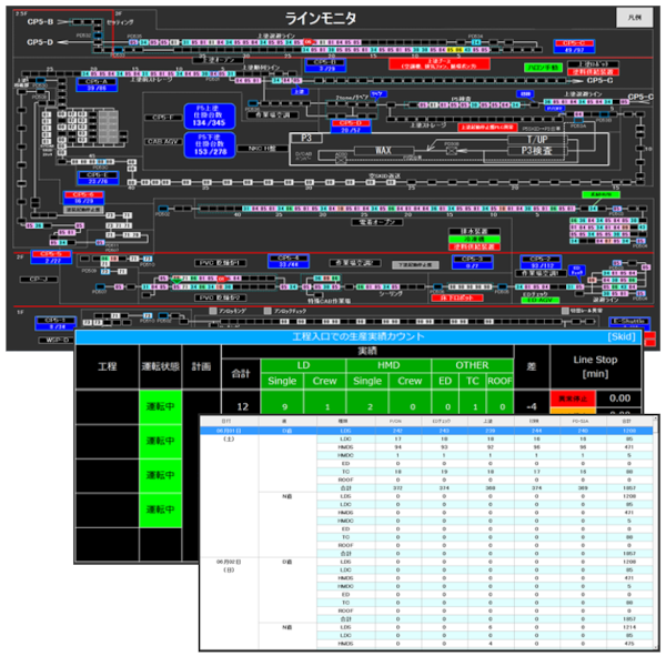 開発したWindowsアプリケーションは、製造ライン上のワーク数や車種、実績数をトラッキングモニタでリアルタイム表示します。通過実績はSQL Serverに保存され、事務所のPC等で随時一覧確認が可能。製造現場の効率化と担当者の負担軽減に貢献しています。