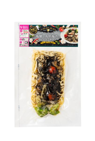 デュラム小麦粉100%の生パスタを使用し、あさりとイカ、色鮮やかなチェリートマトとミニブロッコリーを加えた彩り豊かな一品です。有明海産の風味豊かな海苔をふんだんに使用し、エキストラバージンオリーブオイルと青森県産の雪下にんにく、北海道道南産真昆布を使った昆布茶で深みのある味わいを無添加で実現。