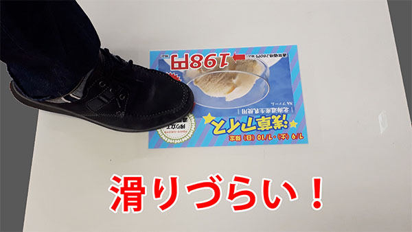 新開発したセルフ施工型の床用POPラミネートで注意喚起やPOP用をラミネーターなどの機械を使わずに挟んで貼れます。従来の床広告は完全委託するため高コストで納期を要していましたが、自分たちで簡単に作れるので床広告をタイムリーかつ低コストで実現できます!