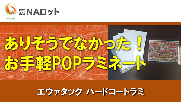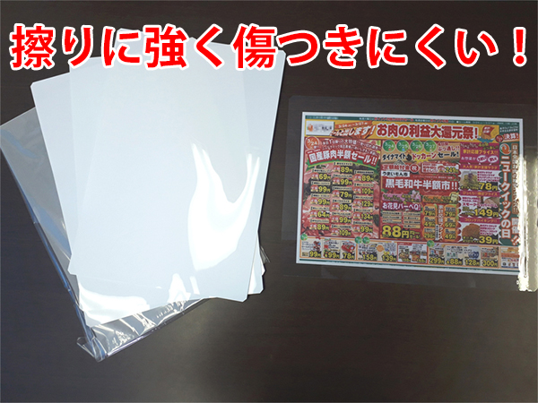スーパーの作荷台やセルフレジ、コンビニのレジ台等のセロテープ痕の根絶を目指して開発されたシートで、印刷物の保護に最適な新しいラミネート製品。
