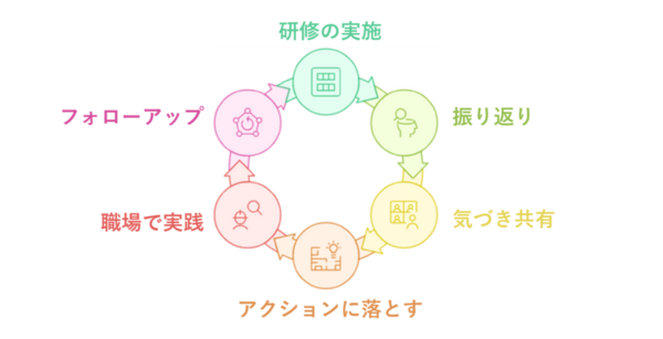 リヴァの研修は座学ではなく、体験・共有・仮説→実践という「変化のサイクル」を「学び」で終わらせず、「やってみた」が自然に職場に持ち帰られるよう設計されています。