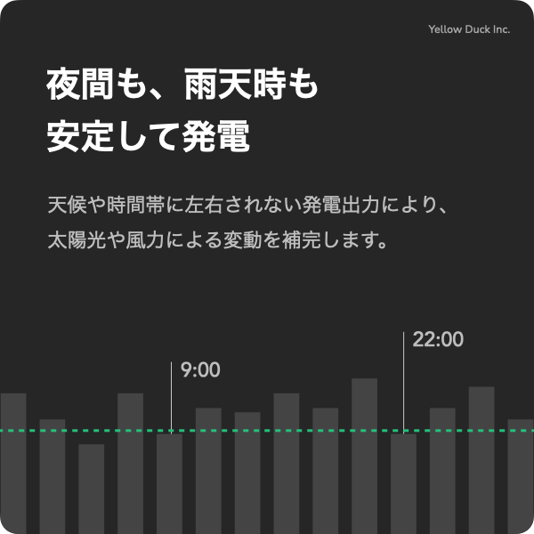 天候や時間帯に左右されない発電特性により、太陽光や風力による変動を補完します。