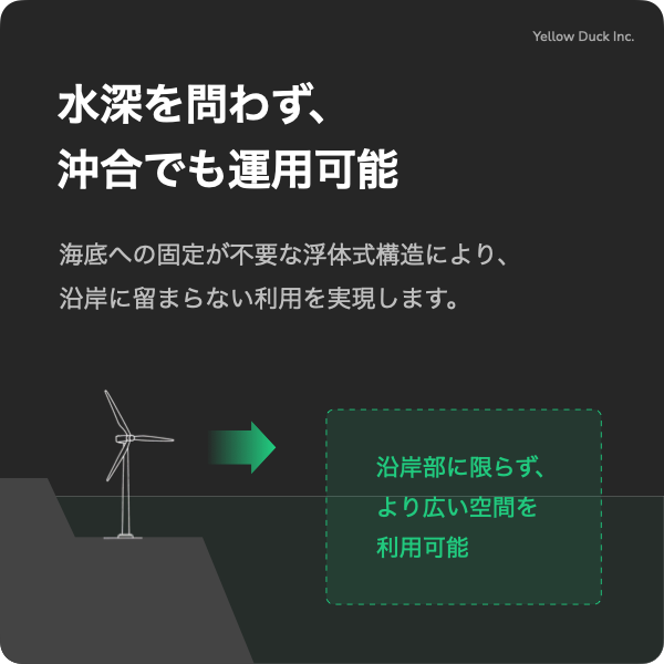 海底への固定が不要な浮体式構造により、沿岸部に留まらない広い海域利用を実現します。
