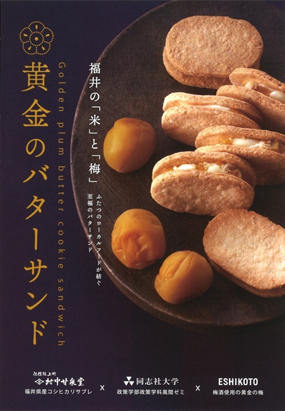 時と県を同じくして、もう1 つのプロジェクトが進んでいました。同志社大学の学生による『ESHIKOTO(福井・永平寺)』この梅酒の梅を使ったフードロス削減につながるお菓子の商品開発です。